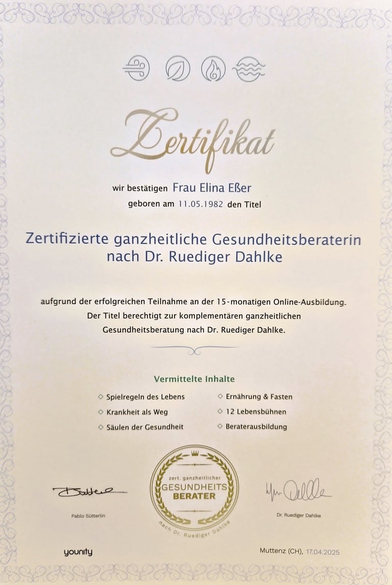 Ich bin Elina Eßer – ganzheitliche Gesundheitsberaterin nach Dr. Rüdiger Dahlke.